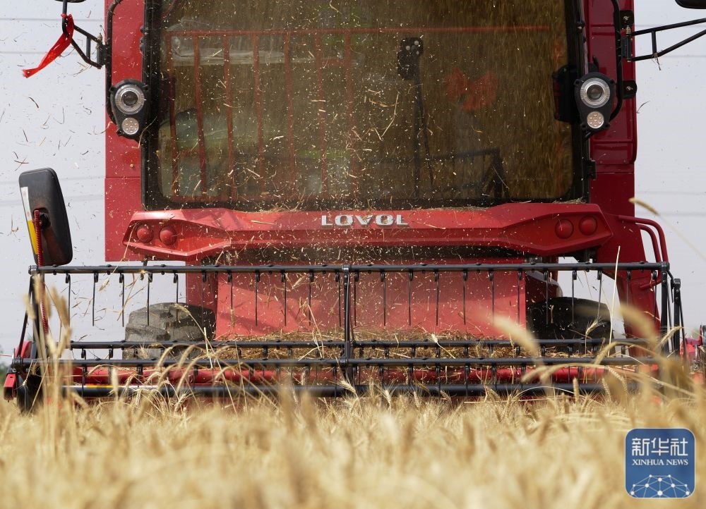 5月26日,農(nóng)民駕駛收割機在河南省寶豐縣鬧店鎮(zhèn)鬧店村麥田里收割小麥。新華社發(fā)(何五昌攝)