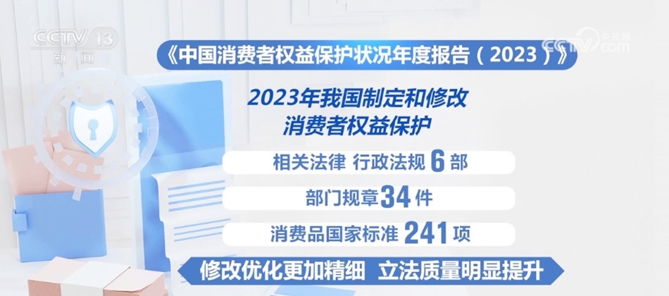 年度報告顯示,2023年我國制定和修改了消費(fèi)者權(quán)益保護(hù)相關(guān)法律、行政法規(guī)6部、部門規(guī)章34件、消費(fèi)品國家標(biāo)準(zhǔn)241項,修改優(yōu)化更加精細(xì),立法質(zhì)量明顯提升。