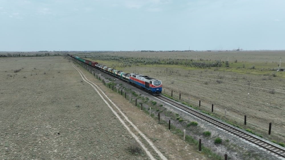 2023年5月12日,在哈薩克斯坦阿拉木圖附近,貨運列車馳騁于阿拉木圖與霍爾果斯間(無人機照片)。新華社發(fā)(奧斯帕諾夫攝)