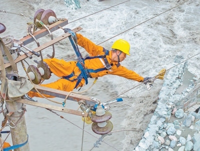 在四川省綿陽(yáng)市平武縣,國(guó)網(wǎng)綿陽(yáng)供電公司黨員突擊隊(duì)隊(duì)員在搶修輸電線路,他的身下就是滔滔洪水。田 海攝(人民視覺)