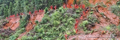 湖南省郴州市資興市八面山瑤族鄉(xiāng),消防救援人員穿越山體滑坡路段,徒步前往受災(zāi)地區(qū)。李 科攝(人民視覺)