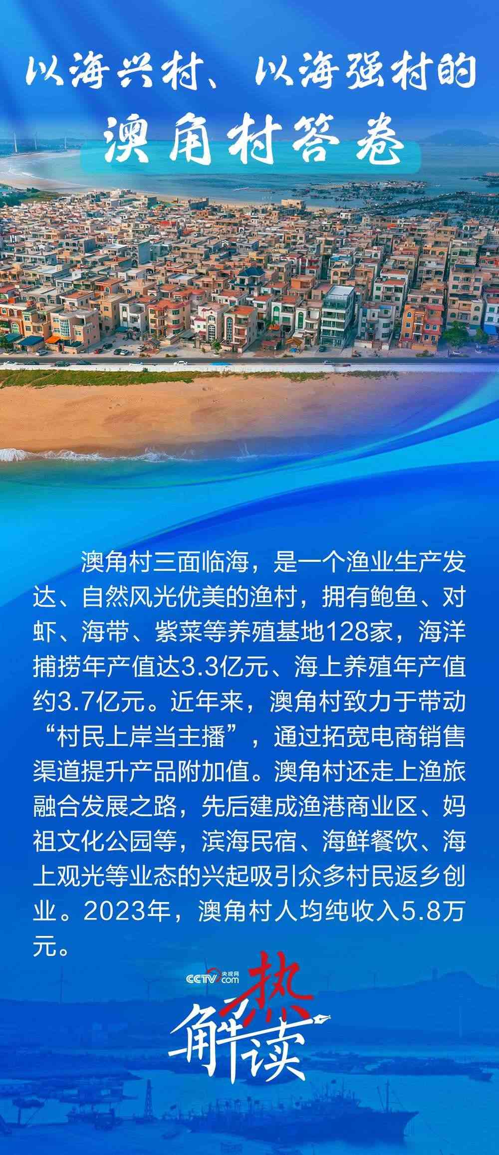 澳角村三面臨海,近年來走出了一條以海興村、以海強(qiáng)村的新路子。看到鄉(xiāng)村發(fā)生了巨變,總書記直言“鄉(xiāng)村振興還是要發(fā)揚優(yōu)勢”,并勉勵澳角村做好“?!钡奈恼拢卩l(xiāng)村振興、共同富裕的道路上一往無前。