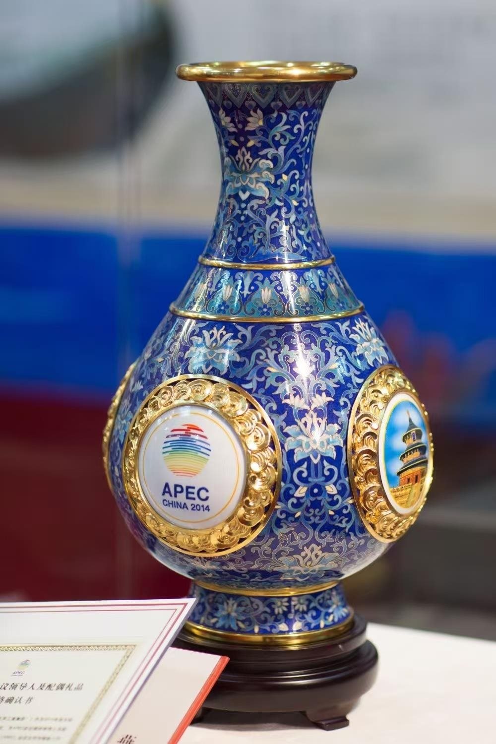 2014年11月,北京APEC會(huì)議在雁棲湖畔舉行。為歡迎參會(huì)的各經(jīng)濟(jì)體領(lǐng)導(dǎo)人,習(xí)近平主席選定了一件國(guó)禮——“四海升平”景泰藍(lán)賞瓶。賞瓶的細(xì)節(jié)蘊(yùn)含巧思:瓶高38厘米,是天壇祈年殿38米的等比例縮??;最大直徑21厘米,代表APEC的21個(gè)經(jīng)濟(jì)體。碧藍(lán)的瓶身雕著水紋,既象征“四?!币泊憝h(huán)太平洋?!捌俊笔恰捌健钡闹C音,連起來(lái)即“四海升平”。