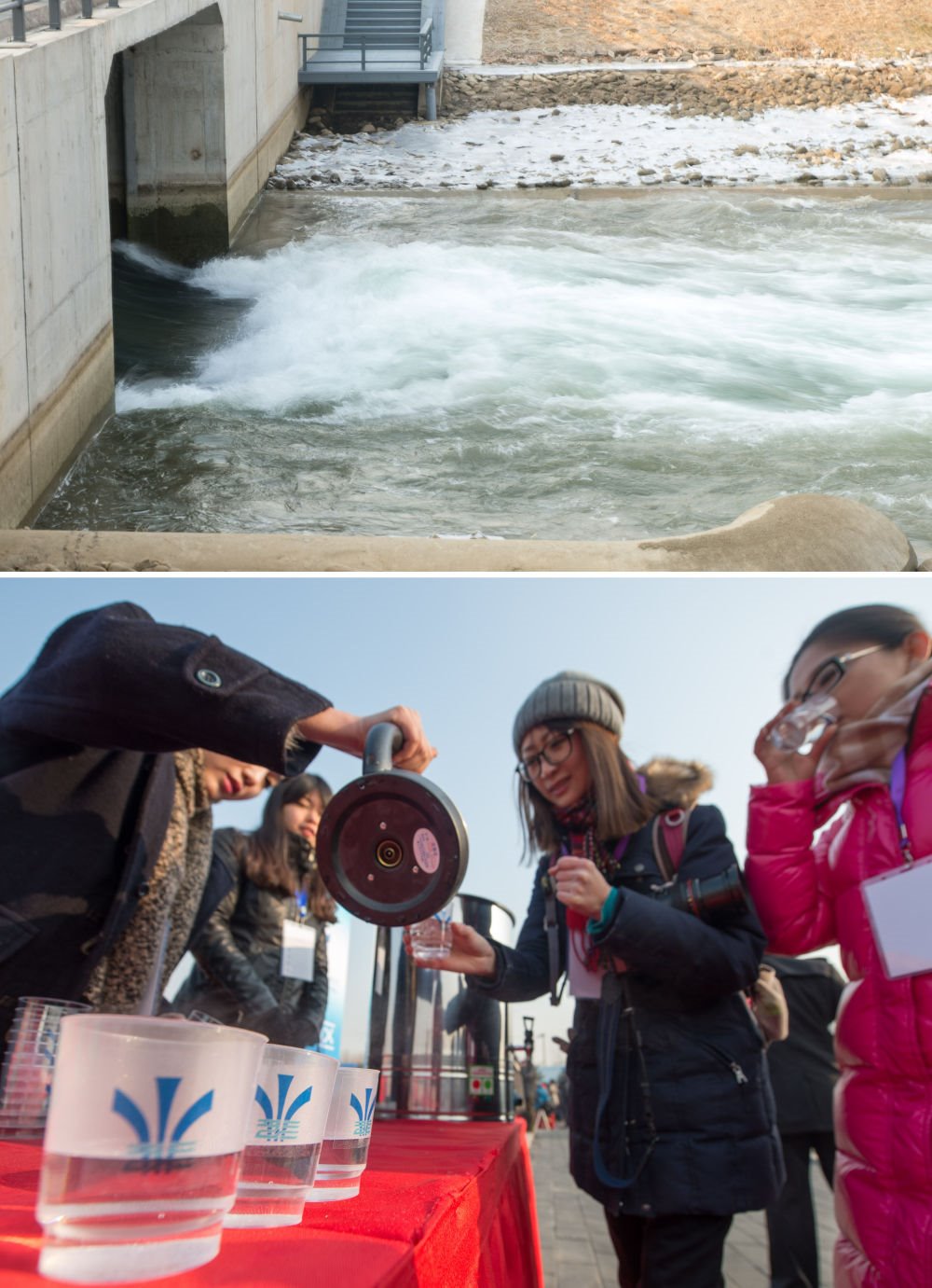 2014年12月27日,南水北調(diào)中線一期工程總干渠終點團城湖明渠開閘放水(上圖);參加通水儀式的嘉賓在北京品嘗了來自丹江口的水(下圖,拼版照片)。