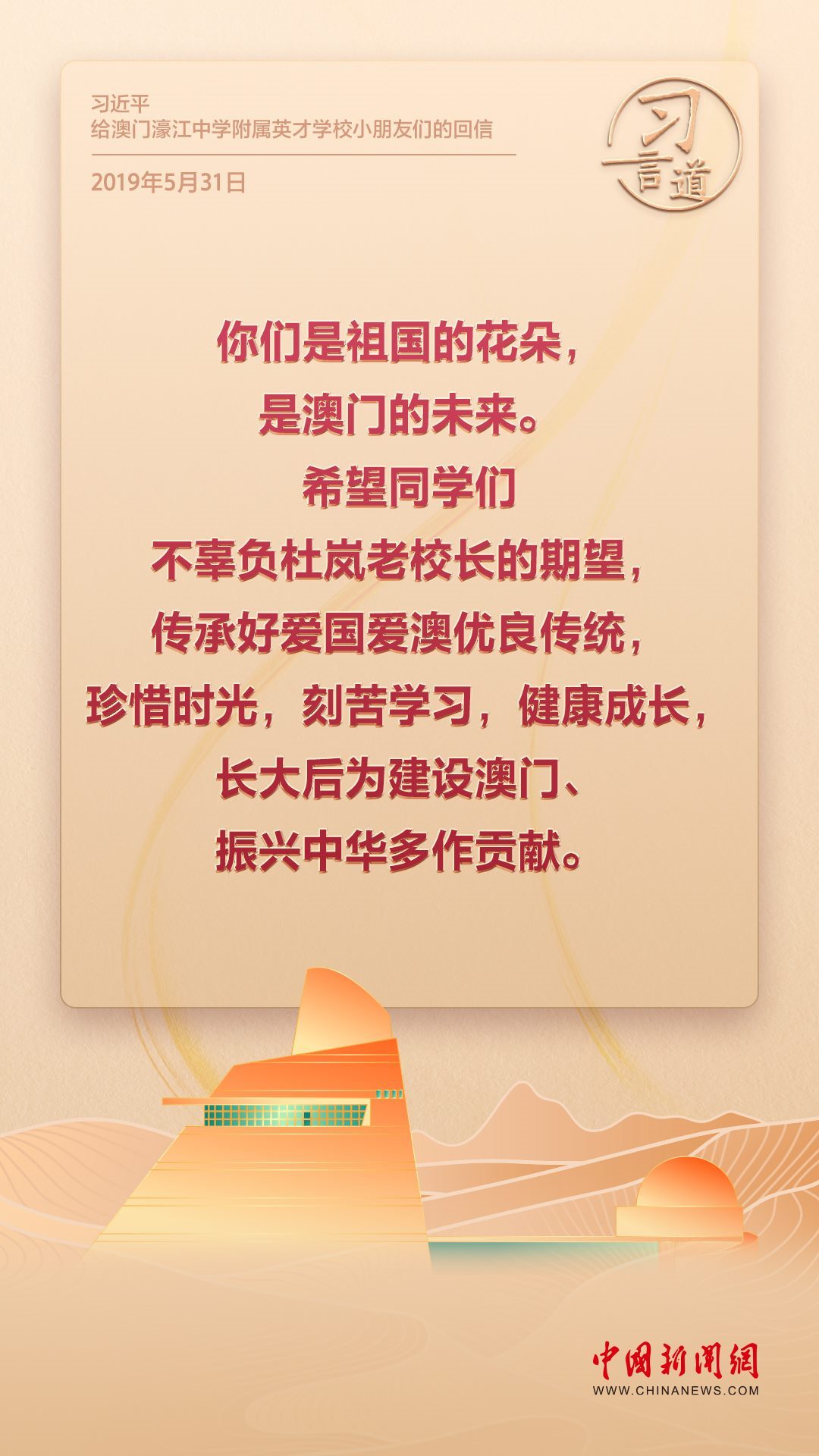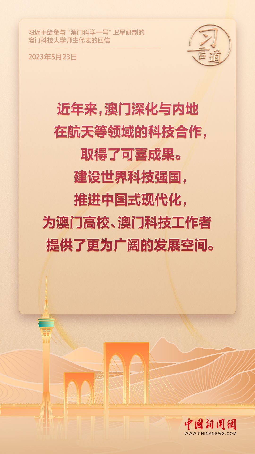 2024年是澳門回歸祖國25周年。多年來,習近平主席始終關注澳門經(jīng)濟社會發(fā)展、百姓福祉,寄語“澳門的發(fā)展厚積薄發(fā)、未來可期”。