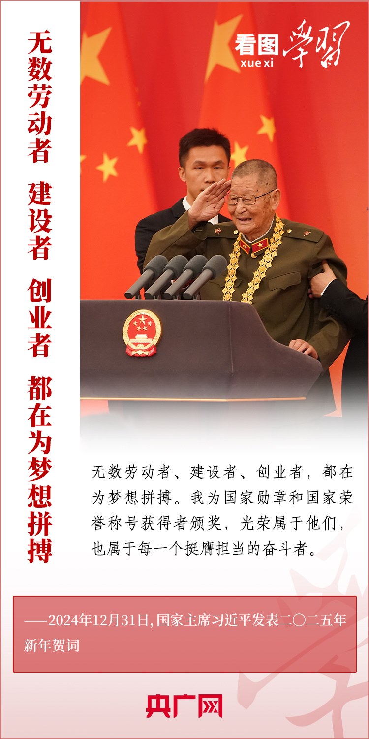 “夢雖遙,追則能達;愿雖艱,持則可圓?!毙履昵跋Γ暯街飨l(fā)表二〇二五年新年賀詞。在溫暖有力的講述中,習主席深情回望過去一年中國不平凡的奮斗歷程、精彩瞬間,感慨大家一道經(jīng)歷的風雨彩虹、難忘時刻,贊美無數(shù)為夢想拼搏的勞動者、建設者、創(chuàng)業(yè)者。習主席說,中國式現(xiàn)代化的新征程上,每一個人都是主角,每一份付出都彌足珍貴,每一束光芒都熠熠生輝。讓我們充滿信心,在新的一年接續(xù)奮斗!