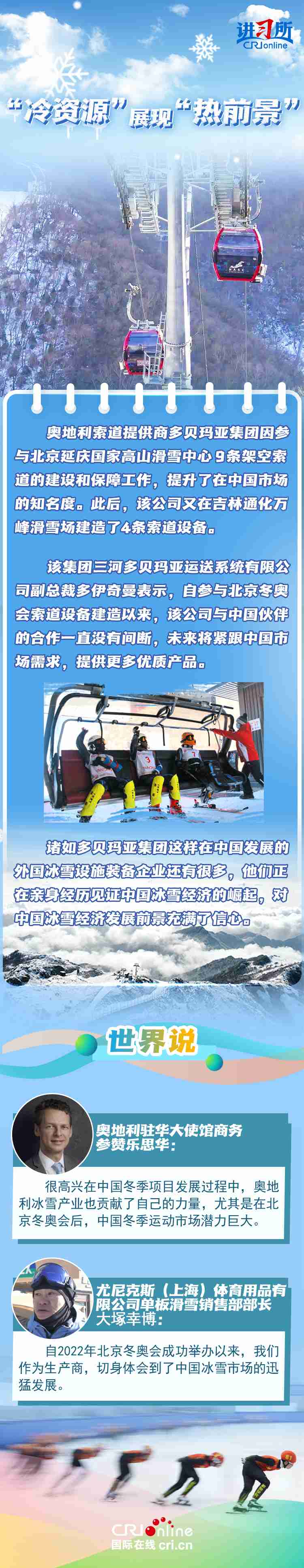 去年年底,中國國務(wù)院辦公廳印發(fā)《關(guān)于以冰雪運(yùn)動高質(zhì)量發(fā)展激發(fā)冰雪經(jīng)濟(jì)活力的若干意見》,旨在鞏固和擴(kuò)大“帶動三億人參與冰雪運(yùn)動”成果,以冰雪運(yùn)動為引領(lǐng),帶動冰雪文化、冰雪裝備、冰雪旅游全產(chǎn)業(yè)鏈發(fā)展,推動冰雪經(jīng)濟(jì)成為新增長點。不少國際組織、企業(yè)和媒體認(rèn)為,中國冰雪經(jīng)濟(jì)的蓬勃發(fā)展,不僅帶來新合作機(jī)遇,更為全球冰雪市場貢獻(xiàn)力量。