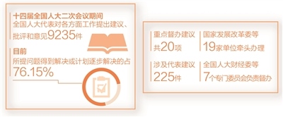 據(jù)全國人大常委會代表工委負責(zé)人介紹,十四屆全國人大二次會議期間,全國人大代表依法履職盡責(zé),對各方面工作提出建議、批評和意見9235件,交由213家承辦單位研究辦理,其中,重點督辦建議共20項。