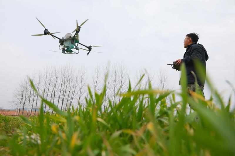 △2025年2月14日,在浙江杭州市臨安區(qū)天目山鎮(zhèn)“天目糧倉(cāng)”糧食功能區(qū),農(nóng)機(jī)人員遙控植保無(wú)人機(jī)給小麥?zhǔn)┓省?/span>