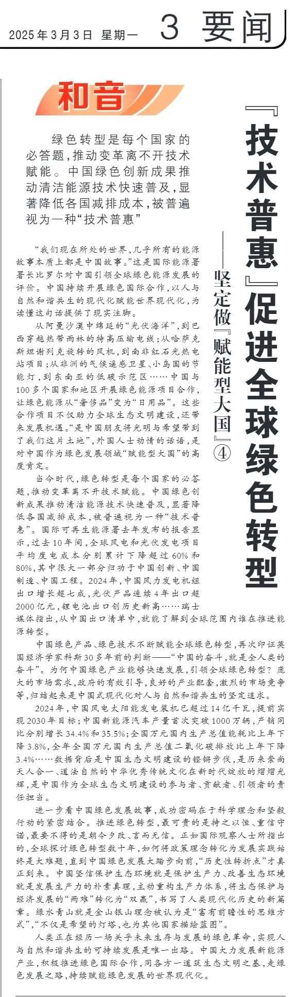 近期,《人民日報(bào)》“和音”欄目推出“堅(jiān)定做‘賦能型大國’”系列評論,圍繞科技創(chuàng)新、開放共贏、綠色轉(zhuǎn)型、高質(zhì)量共建“一帶一路”、多邊治理等熱點(diǎn)議題,從不同角度闡釋中國何以成為一個(gè)“賦能型大國”的深層邏輯,展現(xiàn)中國始終秉持構(gòu)建人類命運(yùn)共同體理念,不斷以中國式現(xiàn)代化為世界現(xiàn)代化賦能的大國擔(dān)當(dāng)。