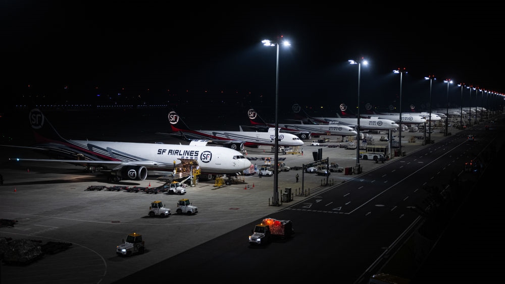 2024年5月25日凌晨,工人在湖北鄂州花湖國際機(jī)場停機(jī)坪裝卸貨物。鄂州花湖國際機(jī)場于2022年7月建成投運,是亞洲首個專業(yè)貨運樞紐機(jī)場。截至2025年1月26日,鄂州花湖國際機(jī)場已開通37條國際貨運航線和66條國內(nèi)貨運航線。