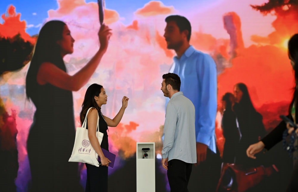 6月25日,嘉賓在第十六屆夏季達沃斯論壇文化之夜上和人形機器人互動。新華社記者 李然 攝