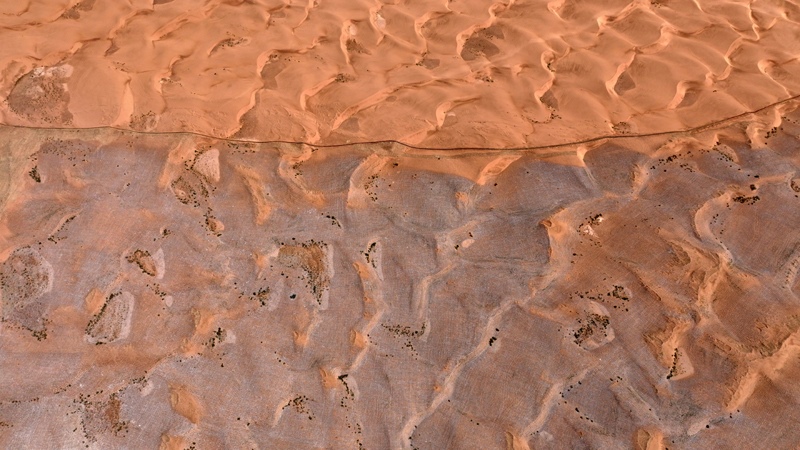 這是6月30日在寧夏中衛(wèi)市長流水村拍攝的騰格里沙漠東南緣治沙鎖邊工程現(xiàn)場(無人機(jī)照片)。