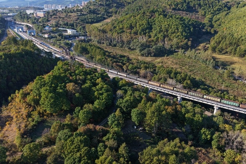 9月27日,滿載大宗品類(lèi)貨物的入境列車(chē)在濱綏鐵路綏芬河至國(guó)境線提質(zhì)改造工程新線路上行駛(無(wú)人機(jī)照片)。
