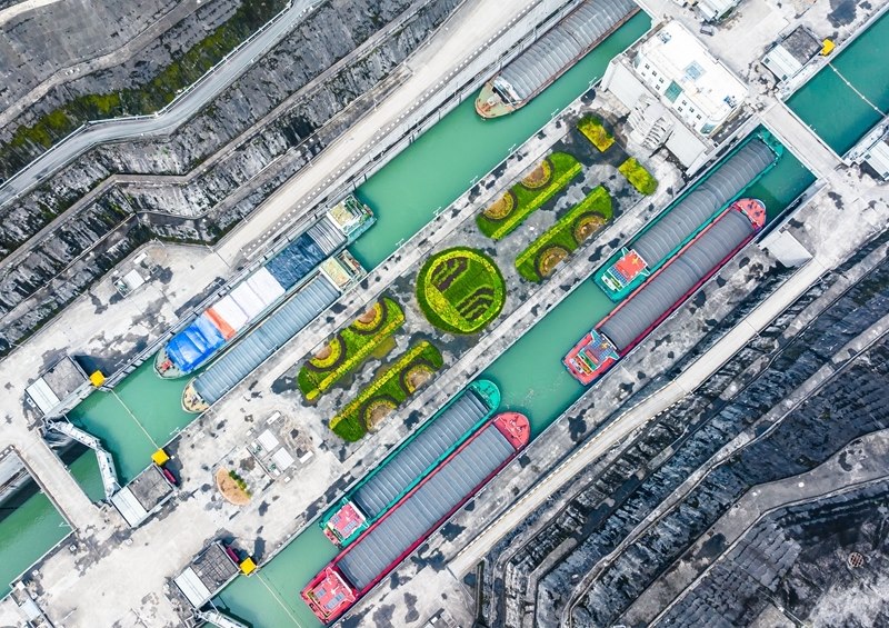 7月1日,在湖北宜昌,船舶有序通過三峽雙線五級船閘(無人機(jī)照片)。