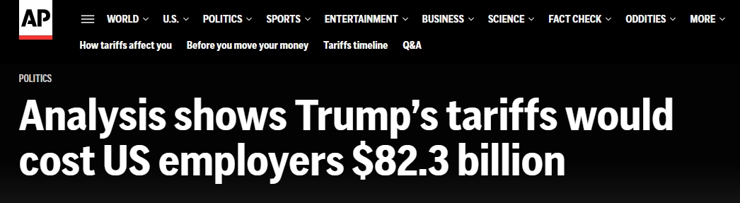 4月份,特朗普政府宣布所謂“對(duì)等關(guān)稅”政策后,金融市場(chǎng)出現(xiàn)恐慌。隨后,又設(shè)定了90天談判期,期間多數(shù)進(jìn)口商品面臨10%基準(zhǔn)稅率。報(bào)道稱(chēng),若4月2日的初始關(guān)稅維持不變,研究中所涉及的企業(yè)將承受更為高昂的1876億美元的額外成本。若按照現(xiàn)行稅率,823億美元成本平均到每位員工身上就是2080美元,相當(dāng)于年均薪資的3.1%。這一平均值涵蓋了無(wú)進(jìn)口業(yè)務(wù)與有進(jìn)口業(yè)務(wù)企業(yè)。
