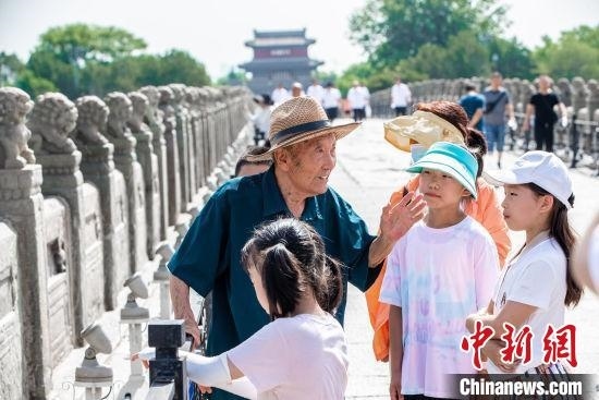 抗戰(zhàn)親歷者鄭福來(lái)在盧溝橋上向游客們講解抗戰(zhàn)史。(資料圖)原梓峰 攝