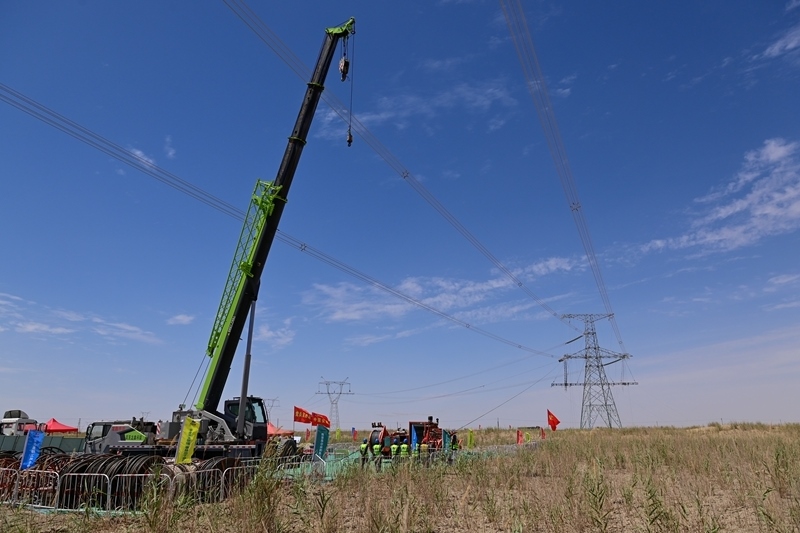 在民豐-且末750千伏線路,作業(yè)人員進(jìn)行導(dǎo)線架設(shè)工作(7月11日攝)。