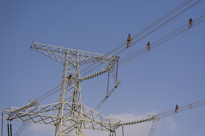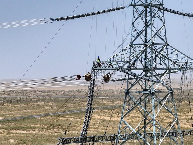 在且末-若羌750千伏線路,施工人員開展走線消缺工作(6月24日攝)。
