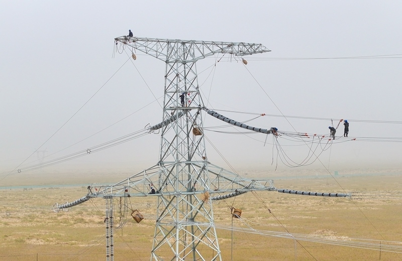 施工人員在且末-若羌750千伏線路開展走線消缺工作(6月24日攝)。