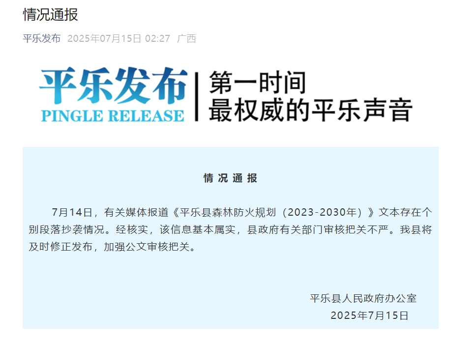 7月14日,有關(guān)媒體報(bào)道《平樂(lè)縣森林防火規(guī)劃(2023-2030年)》文本存在個(gè)別段落抄襲情況。經(jīng)核實(shí),該信息基本屬實(shí),縣政府有關(guān)部門審核把關(guān)不嚴(yán)。我縣將及時(shí)修正發(fā)布,加強(qiáng)公文審核把關(guān)。