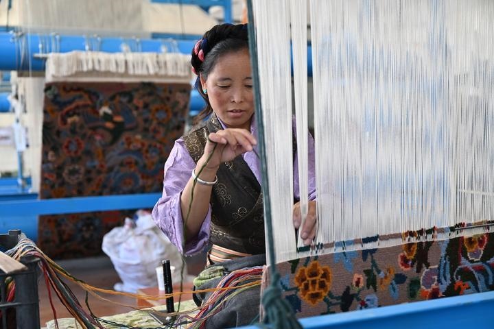 在日喀則市江孜縣的一家藏毯編織車間里,珍拉正盤腿坐在織架前,雙手在密集的經線間靈巧地穿梭、挑動、打結,一幅寓意吉祥的大鵬金翅鳥圖案,在她手下逐漸成形。