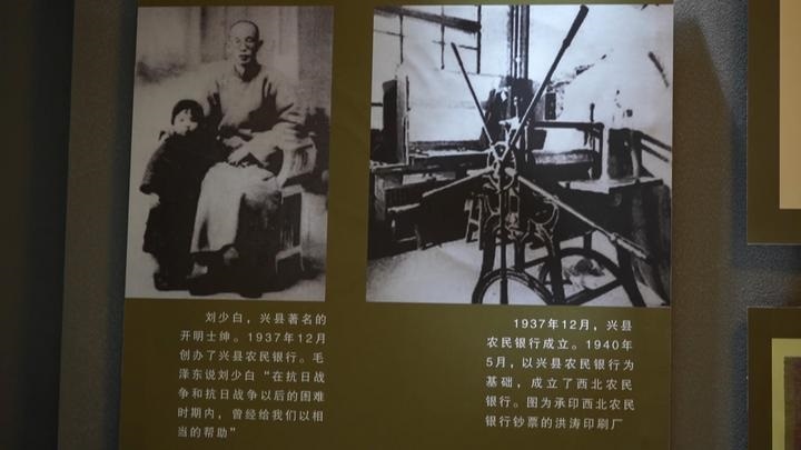 講解員張英介紹說,1937年7月7日,盧溝橋事變爆發(fā),全面抗戰(zhàn)開始,當(dāng)時(shí)八路軍120師的主力(部隊(duì))挺進(jìn)了晉西北,創(chuàng)建了晉西北的抗日根據(jù)地?!爱?dāng)時(shí)我們這個(gè)根據(jù)地的經(jīng)濟(jì)比較繁雜,在當(dāng)時(shí)不僅有偽鈔、法幣還有銀元,以及閻錫山的晉鈔,所以為了有一個(gè)我們中國共產(chǎn)黨領(lǐng)導(dǎo)的銀行,當(dāng)時(shí)就創(chuàng)建了興縣農(nóng)民銀行。1937年12月份的時(shí)候,開明士紳劉少白專門從太原返回到興縣籌備資金,籌備了6萬銀元以及700石糧食,其中蔡家崖的開明士紳牛友蘭獻(xiàn)出了總價(jià)值2.3萬銀元、物資和150石糧食,后期還有楊家坡的楊邦漢獻(xiàn)出了價(jià)值1.5萬元的房地產(chǎn)?!睆堄⒈硎?。