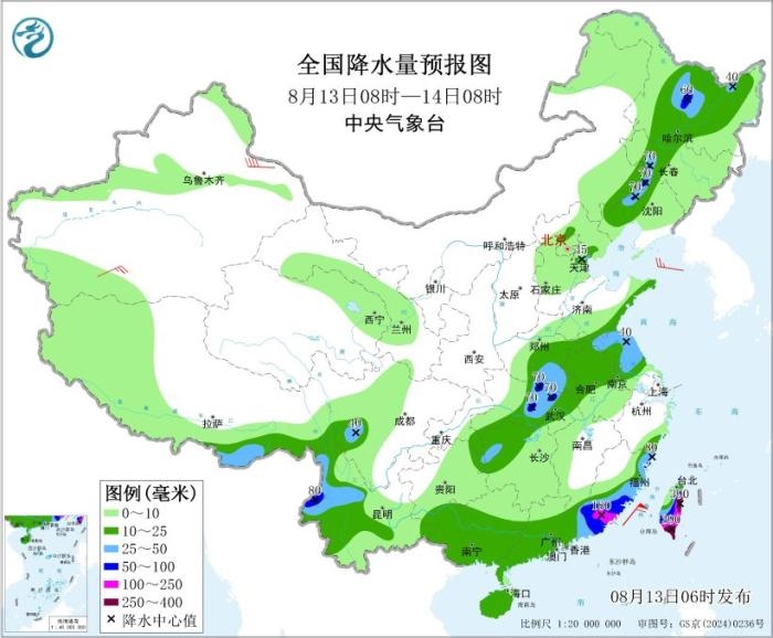 8月13日08時(shí)至14日08時(shí),黑龍江中部、吉林西部、遼寧西部、河南南部、湖北中部、江蘇北部、云南西部、廣東東部、福建東部和南部、西藏南部、臺(tái)灣島大部等地部分地區(qū)有大到暴雨,其中,福建東南部、廣東東南部、臺(tái)灣島東部和南部等地部分地區(qū)有大暴雨,臺(tái)灣島東部和南部等地局地特大暴雨(250~390毫米)。臺(tái)灣以東洋面有12~13級(jí)風(fēng),陣風(fēng)14~15級(jí);臺(tái)灣海峽、巴士海峽有10~11級(jí)風(fēng),陣風(fēng)12~13級(jí)。