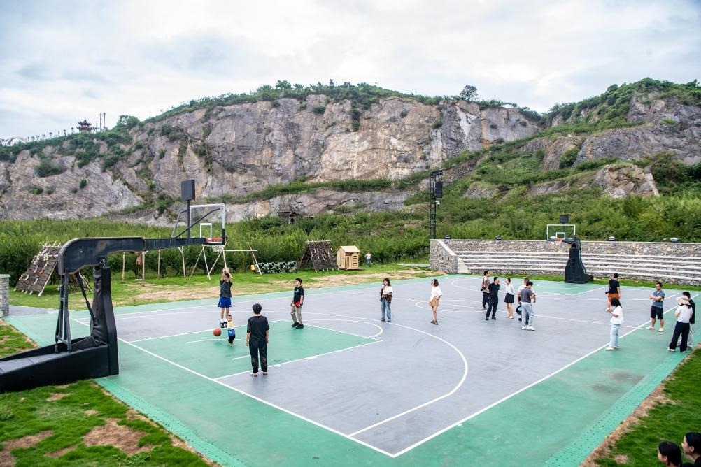 8月16日,在重慶市北碚區(qū)靜觀鎮(zhèn)中華村,游客在礦坑修復改造的運動場內打球。新華社記者 唐奕 攝