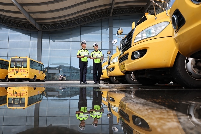 8月25日,湖北省襄陽市??悼h公安局交警大隊民警對校車進行安全檢查(無人機照片)。