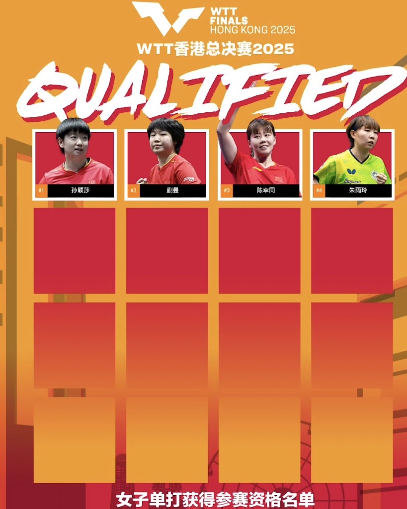 中國(guó)隊(duì)孫穎莎、蒯曼、陳幸同及中國(guó)澳門(mén)隊(duì)的朱雨玲獲得WTT香港總決賽女子單打參賽資格。圖片來(lái)自WTT世界乒聯(lián)官方微博