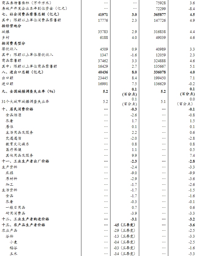 總的來看,前三季度穩(wěn)就業(yè)穩(wěn)經(jīng)濟政策舉措接續(xù)發(fā)力,主要宏觀指標總體平穩(wěn),經(jīng)濟運行保持穩(wěn)中有進態(tài)勢,高質(zhì)量發(fā)展取得積極成效。也要看到,當前經(jīng)濟運行仍面臨不少風險挑戰(zhàn),外部不穩(wěn)定不確定因素較多,國內(nèi)經(jīng)濟回升向好基礎(chǔ)仍需加力鞏固。下階段,要堅持以習近平新時代中國特色社會主義思想為指導(dǎo),全面貫徹落實黨中央決策部署,堅持穩(wěn)中求進工作總基調(diào),推動更加積極有為的宏觀政策落地增效,著力穩(wěn)就業(yè)、穩(wěn)企業(yè)、穩(wěn)市場、穩(wěn)預(yù)期,扎實推動高質(zhì)量發(fā)展,促進經(jīng)濟持續(xù)健康發(fā)展。