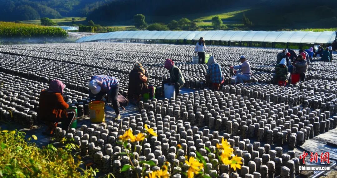 (菌農(nóng)們正在采摘。黃松甸鎮(zhèn)供圖)