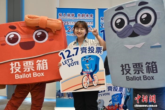 10月23日,香港特區(qū)政府和選舉管理委員會(huì)舉行2025年立法會(huì)換屆選舉啟動(dòng)禮,為第八屆立法會(huì)選舉揭開(kāi)序幕。圖為一名女士與“票箱家族”角色合影?!≈行律缬浾?李志華 攝