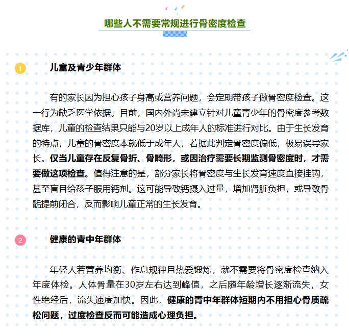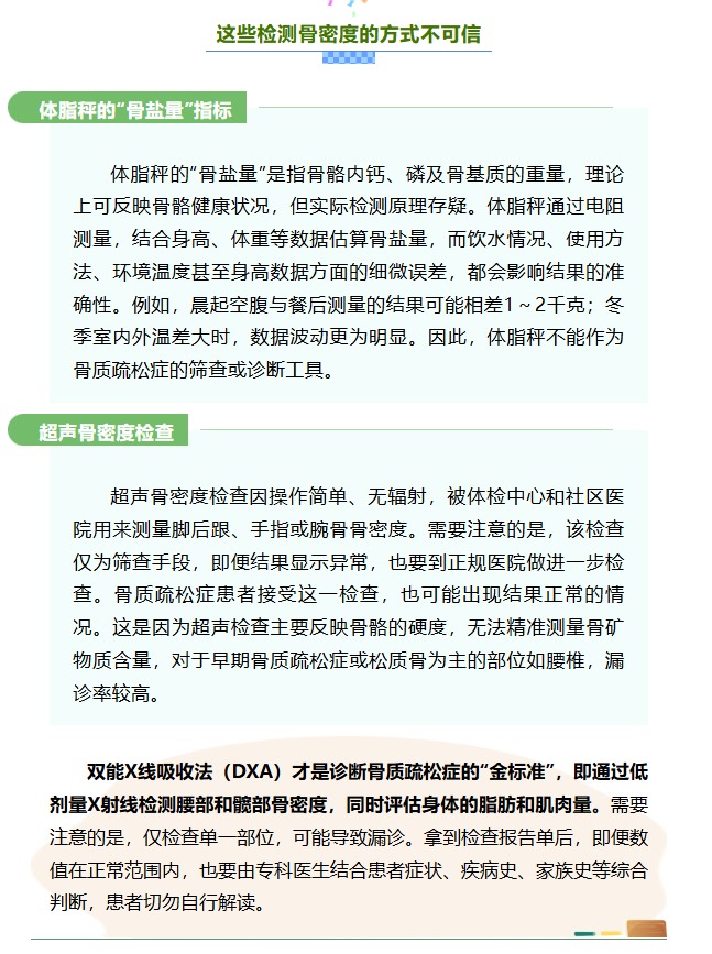 骨骼健康是人體健康的重要組成部分,其評估指標不僅包括鈣含量,還涉及骨骼強度等多方面的因素,而骨密度在一定程度上,可以反映骨骼健康狀態(tài)。需要明確的是,并非人人都需要進行骨密度檢查。而且,當下流行的體脂秤及體檢中常用的超聲骨密度檢查,均不能作為診斷骨質(zhì)疏松癥的依據(jù)。正確認識骨密度檢查的適用人群,既能避免醫(yī)療資源浪費,也能減少不必要的健康焦慮。