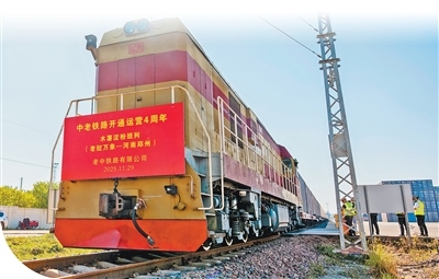 11月29日,一列滿載1000噸木薯淀粉的鐵路集裝箱班列從中老鐵路萬象南站駛出,準(zhǔn)備發(fā)往河南鄭州。這是老撾首次成列運輸輸華的木薯淀粉。凱 喬攝(新華社發(fā))