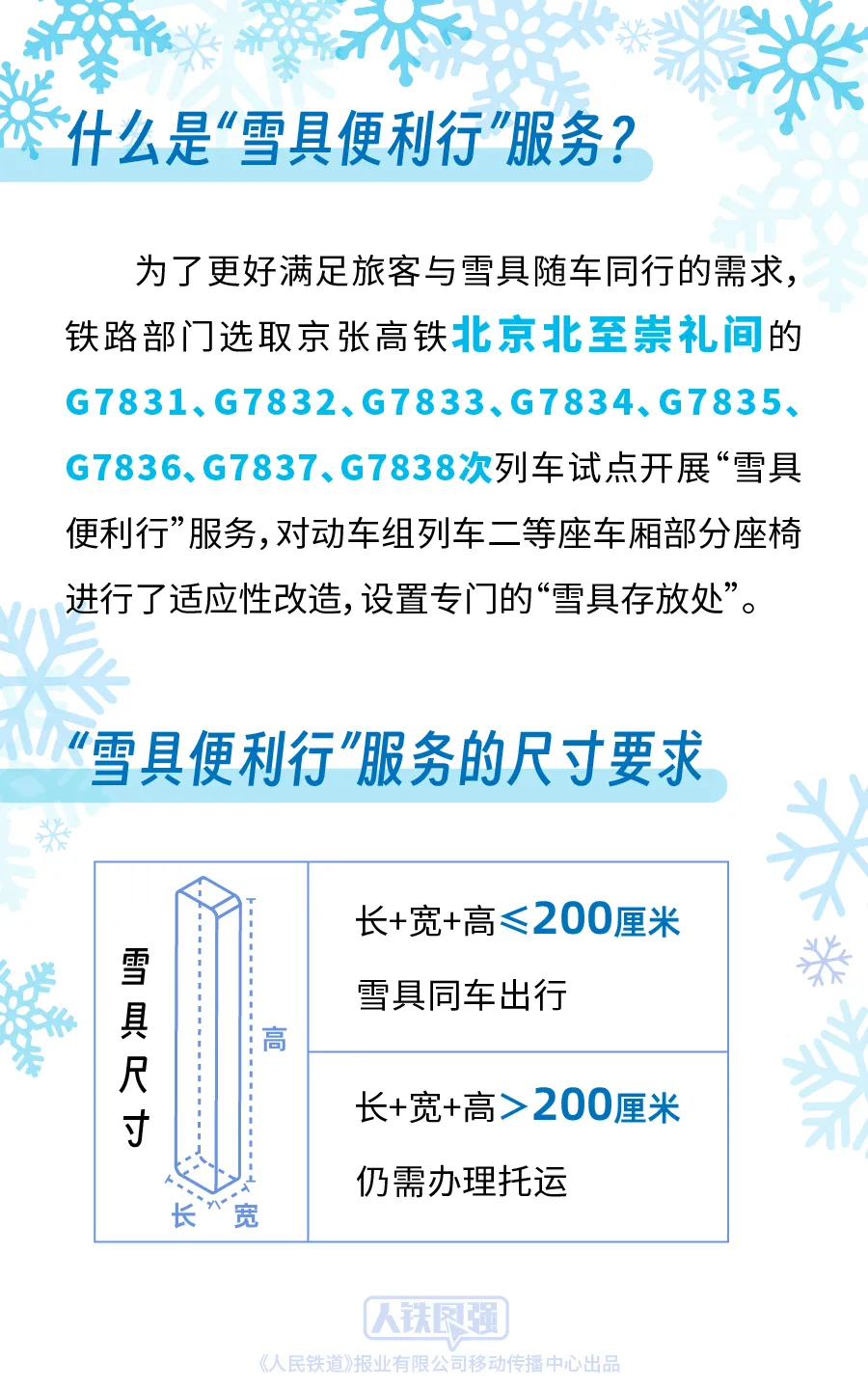 鐵路部門(mén)堅(jiān)持以人民為中心的發(fā)展思想,持續(xù)深化運(yùn)輸供給側(cè)結(jié)構(gòu)性改革,積極適應(yīng)旅客多樣化的出行需求,為攜帶雪具出行的旅客提供便捷服務(wù)。前期,鐵路部門(mén)按照《國(guó)鐵集團(tuán)鐵路旅客運(yùn)輸規(guī)程》“旅客乘坐動(dòng)車(chē)組列車(chē)隨身攜帶的行李物品長(zhǎng)、寬、高之和不超過(guò)130厘米”的規(guī)定,對(duì)超過(guò)上述尺寸標(biāo)準(zhǔn)的雪具推出了“雪具快運(yùn)”服務(wù)。為了更好滿(mǎn)足旅客與雪具隨車(chē)同行的需求,鐵路部門(mén)統(tǒng)籌考慮旅客安全、乘車(chē)秩序和雪具運(yùn)輸需求,選取京張高鐵北京北至崇禮間的G7831、G7832、G7833、G7834、G7835、G7836、G7837、G7838次列車(chē)試點(diǎn)開(kāi)展“雪具便利行”服務(wù),對(duì)動(dòng)車(chē)組列車(chē)二等座車(chē)廂部分座椅進(jìn)行了適應(yīng)性改造,設(shè)置專(zhuān)門(mén)的“雪具存放處”,旅客選擇該服務(wù)后可攜帶長(zhǎng)、寬、高之和不超過(guò)200厘米的雪具同車(chē)出行,滑雪更加方便快捷。對(duì)于長(zhǎng)、寬、高之和超過(guò)200厘米的雪具,由于高鐵列車(chē)車(chē)內(nèi)空間限制,仍需辦理托運(yùn)。