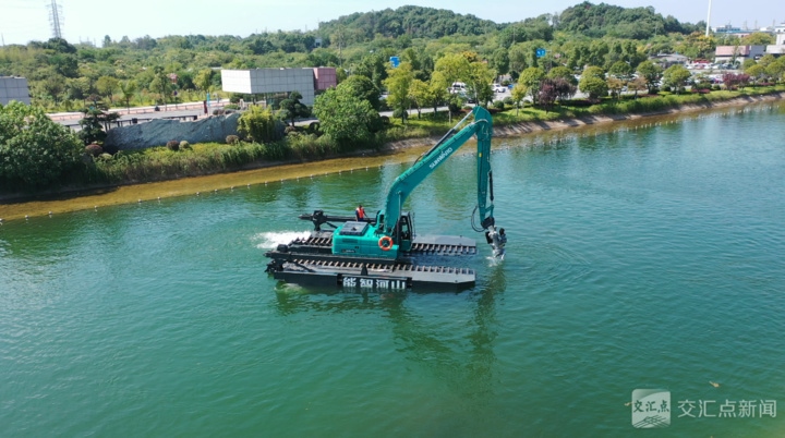 只見一臺身披“山河綠”的水陸兩棲挖掘機(jī)穩(wěn)穩(wěn)地在水中行駛。駕駛室里的工程師輕拉搖桿,這個足有兩層樓高的“鋼鐵巨獸”便靈活轉(zhuǎn)身,履帶劃過水面,泛起層層漣漪——輕巧的身姿完全顛覆了人們對挖掘機(jī)“只能在地上笨重行走”的固有印象。