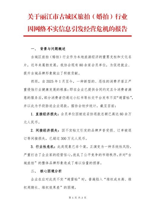 今年10月,麗江市古城區(qū)旅拍行業(yè)協(xié)會發(fā)布的《關(guān)于麗江市古城區(qū)旅拍(婚拍)行業(yè)因網(wǎng)絡(luò)不實信息引發(fā)經(jīng)營危機的報告》。