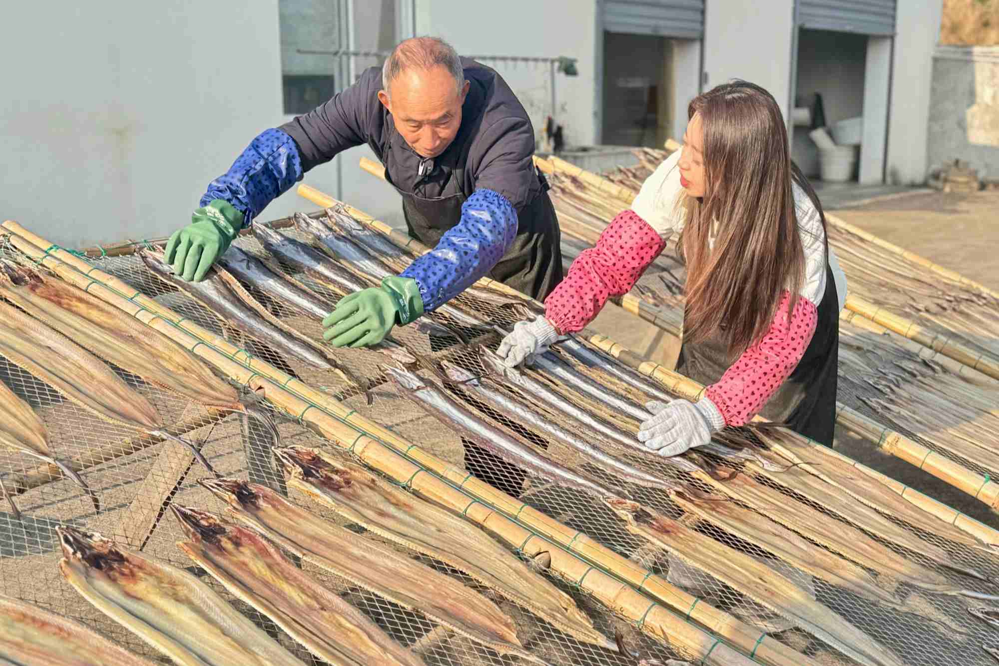 曬魚(yú)鲞是海島群眾的傳統(tǒng)習(xí)俗。近日,在當(dāng)?shù)剡h(yuǎn)近聞名的魚(yú)鲞專(zhuān)業(yè)村——茅洋鄉(xiāng)文洋村的文山一品魚(yú)鲞廠里,工人們正趁著晴好天氣忙著翻曬魚(yú)鲞,空氣中彌漫著咸鮮的海風(fēng)氣息。選鮮、處理、腌制、晾曬的傳統(tǒng)工序與現(xiàn)代化流水線并行運(yùn)轉(zhuǎn),廠長(zhǎng)鮑財(cái)富一邊指導(dǎo)工人包裝,一邊向記者介紹:“我從事這行已經(jīng)30余年了,多的時(shí)候日產(chǎn)量能有一二千斤,一般都是批量賣(mài)給飯店。”