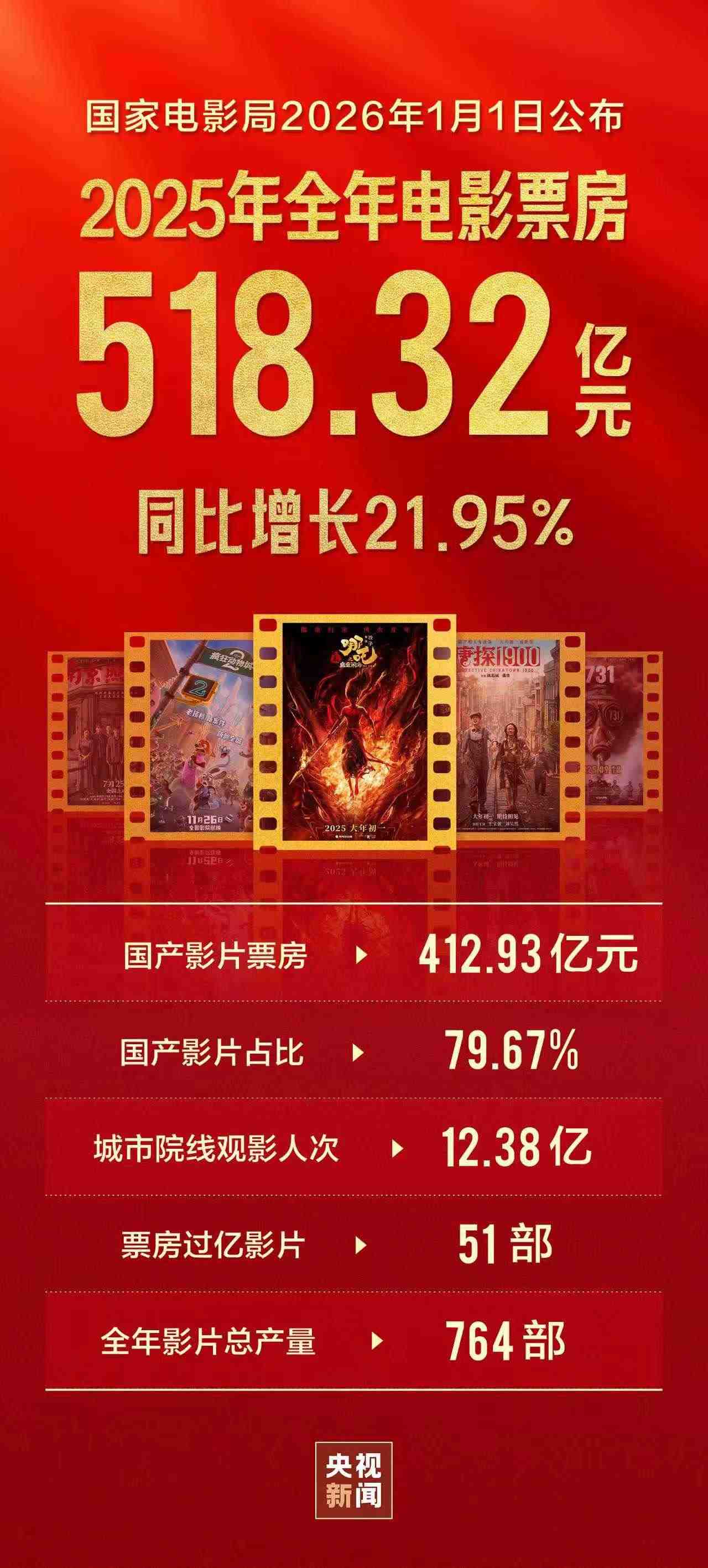 國(guó)家電影局2026年1月1日公布,2025年電影票房為518.32億元,同比增長(zhǎng)21.95%,城市院線觀影人次為12.38億,同比增長(zhǎng)為22.57%,國(guó)產(chǎn)影片票房為412.93億元,占比為79.67%。