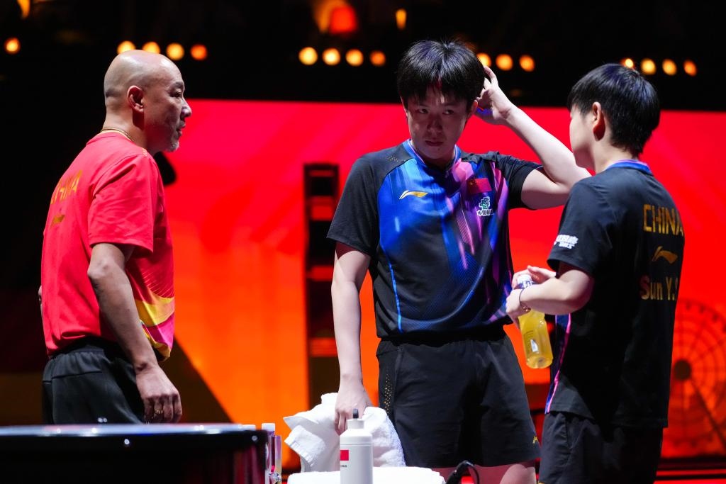 2025年12月12日,中國(guó)隊(duì)教練肖戰(zhàn)(左)在比賽暫停時(shí)指導(dǎo)王楚欽(中)/孫穎莎。當(dāng)日,在香港進(jìn)行的2025年世界乒乓球職業(yè)大聯(lián)盟(WTT)總決賽混雙小組賽中,中國(guó)組合王楚欽/孫穎莎3比2戰(zhàn)勝中國(guó)香港組合黃鎮(zhèn)廷/杜凱琹。新華社記者 朱煒 攝