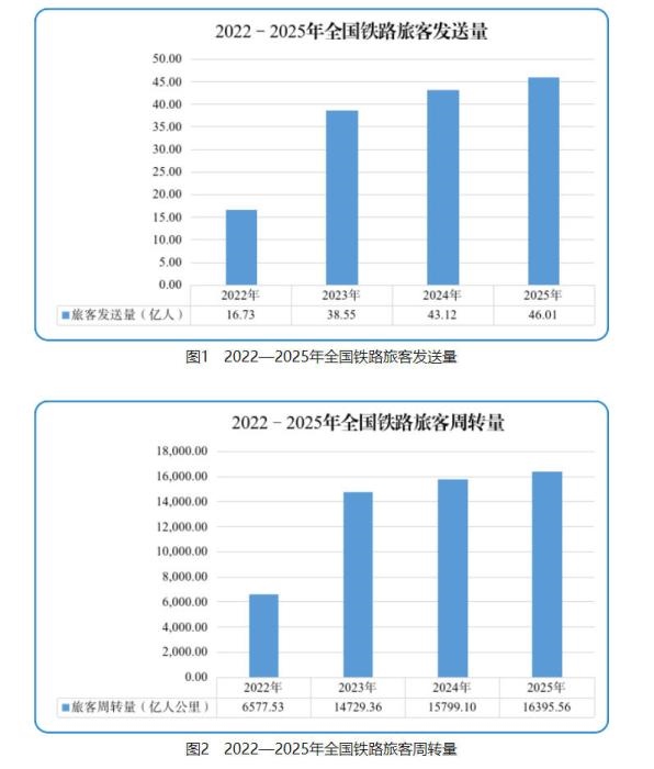 客運方面。2025年,全國鐵路累計完成旅客發(fā)送量46.01億人,同比增長6.7%;完成旅客周轉(zhuǎn)量16395.56億人公里,同比增長3.8%。12月份,完成旅客發(fā)送量3.23億人,同比增長8.5%;完成旅客周轉(zhuǎn)量1015.59億人公里,同比增長6.0%。