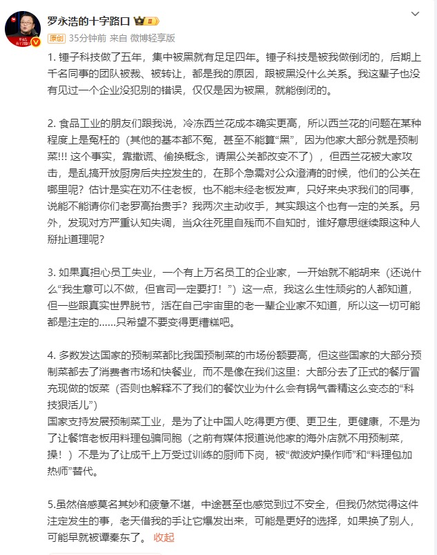 1月16日,@羅永浩的十字路口 再次發(fā)長文回應西貝賈國龍近日的言論。他表示,錘子科技做了五年,集中被黑就有足足四年。錘子科技是被我做倒閉的,后期上千名同事的團隊被裁、被轉(zhuǎn)讓,都是我的原因,跟被黑沒什么關系。我這輩子也沒有見過一個企業(yè)沒犯別的錯誤,僅僅是因為被黑,就能倒閉的。