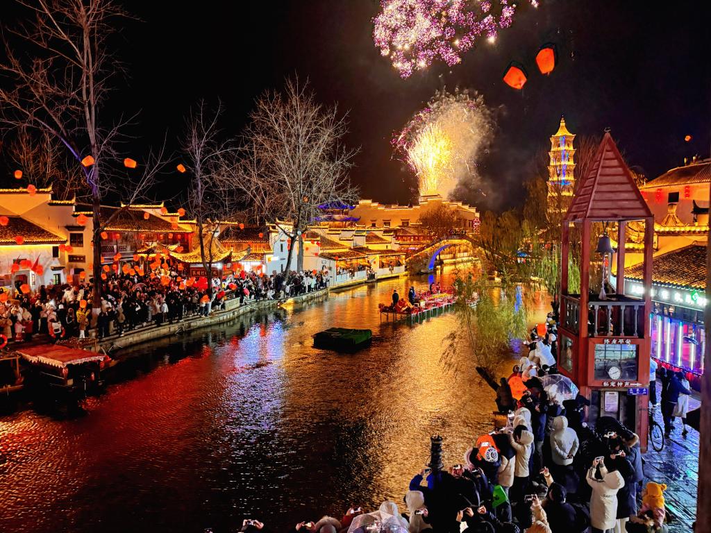 除夕夜,走進(jìn)安徽省銅陵市義安區(qū)犁橋水鎮(zhèn),只見(jiàn)煙花漫天、燈火璀璨,身著漢服的游客漫步街巷。