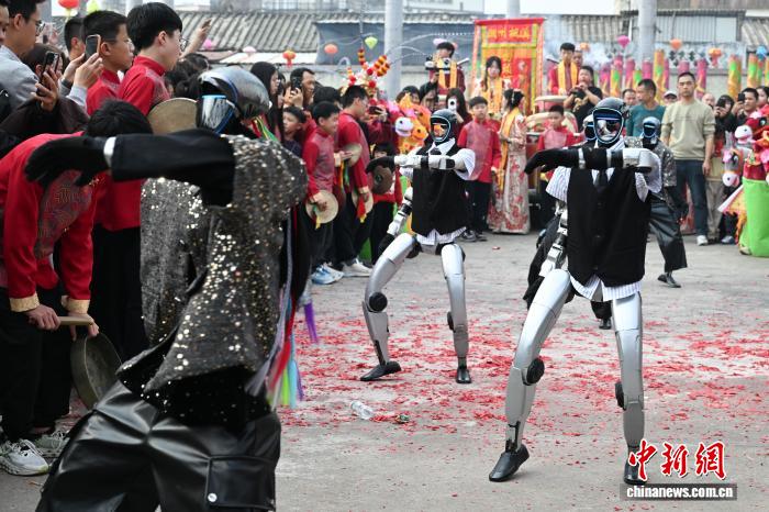 2月24日,廣東省潮州市田頭何村開展民俗巡游活動,機(jī)器人與布馬舞舞者共舞,吸引村民觀看。中新社記者 陳楚紅 攝