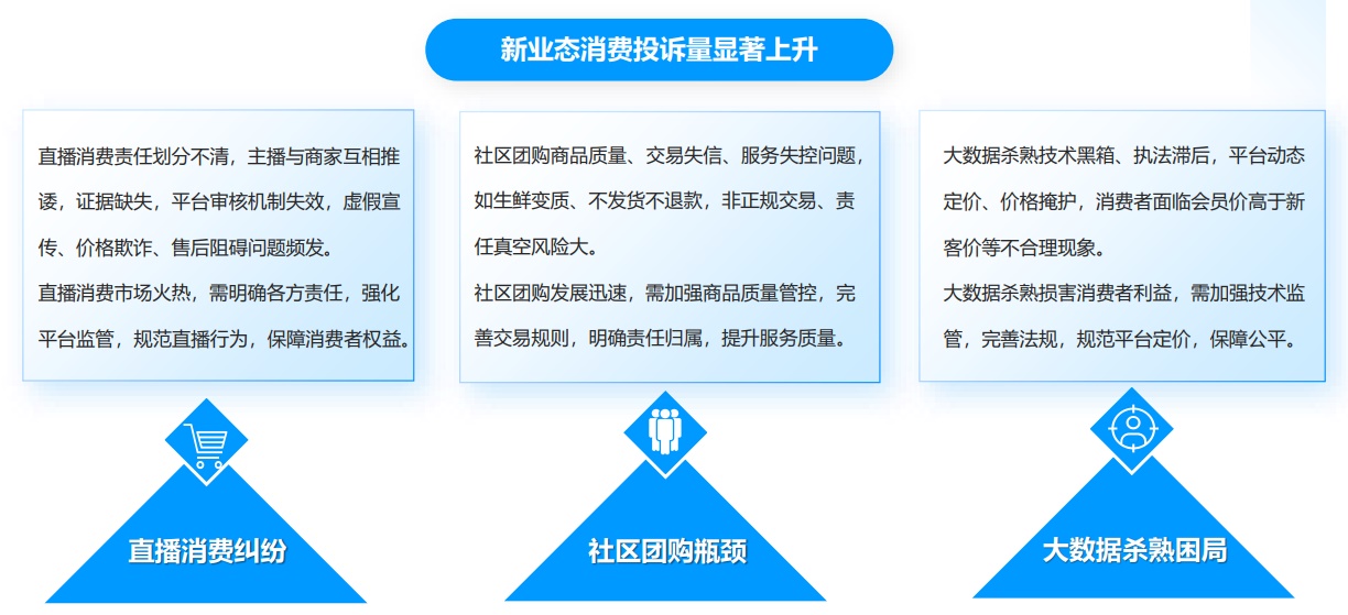 另一方面是新領(lǐng)域“新痛點(diǎn)”愈加顯現(xiàn)。“人民投訴”觀察到,過去一年,直播電商、社區(qū)團(tuán)購、大數(shù)據(jù)殺熟等新模式新業(yè)態(tài)中的消費(fèi)投訴顯著上升。