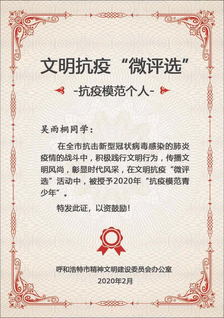 此外,學生吳雨桐和張琳哲分別被授予2020年“抗疫模范青少年”榮譽稱號。