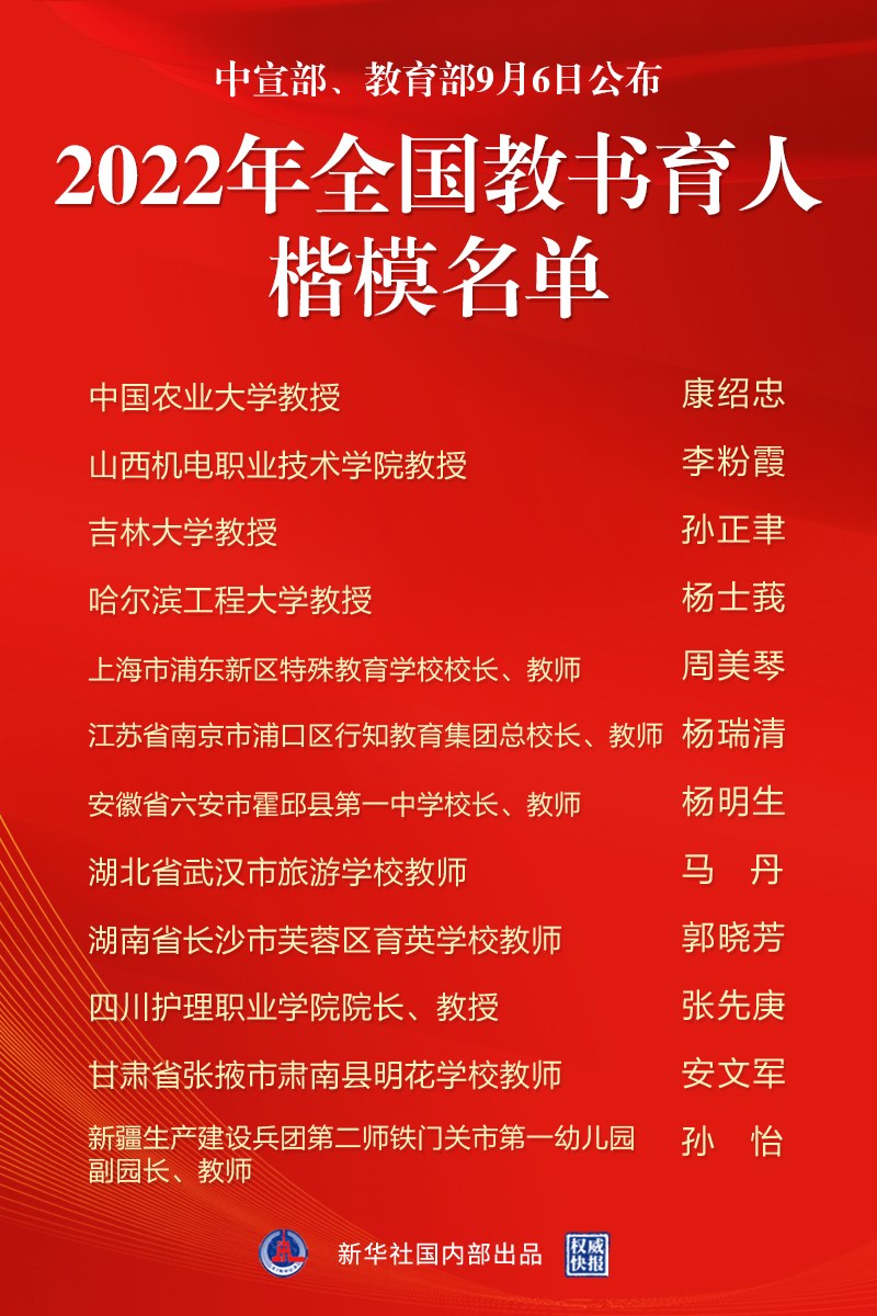 這12位全國教書育人楷模,有的深耕思政課堂、傳播黨的創(chuàng)新理論,有的勇攀科研高峰、取得顯著成果,有的一輩子扎根基層、矢志奉獻山區(qū)教育,有的創(chuàng)新思路方法、為孩子傾注大愛深情,充分展示了新時代教師隊伍有理想信念、有道德情操、有扎實學識、有仁愛之心的良好精神風貌,是廣大人民教師的優(yōu)秀代表和杰出典范。他們是:中國農(nóng)業(yè)大學教授康紹忠,山西機電職業(yè)技術學院教授李粉霞,吉林大學教授孫正聿,哈爾濱工程大學教授楊士莪,上海市浦東新區(qū)特殊教育學校校長、教師周美琴,江蘇省南京市浦口區(qū)行知教育集團總校長、教師楊瑞清,安徽省六安市霍邱縣第一中學校長、教師楊明生,湖北省武漢市旅游學校教師馬丹,湖南省長沙市芙蓉區(qū)育英學校教師郭曉芳,四川護理職業(yè)學院院長、教授張先庚,甘肅省張掖市肅南縣明花學校教師安文軍,新疆生產(chǎn)建設兵團第二師鐵門關市第一幼兒園副園長、教師孫怡。