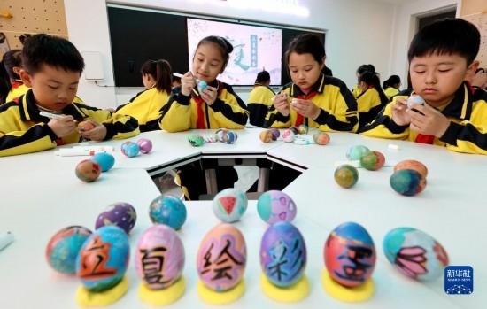5月5日,在山東省棗莊市東湖小學(xué),學(xué)生們?cè)诶L制彩蛋。